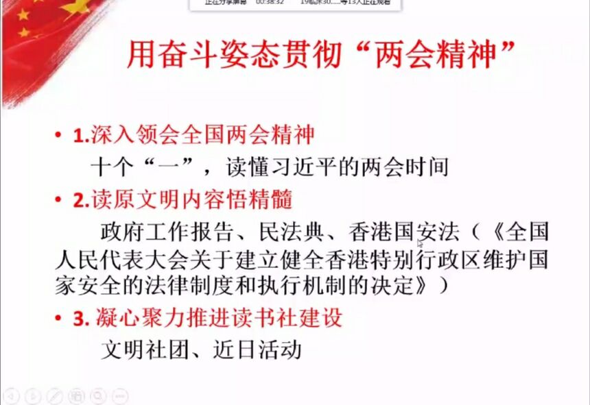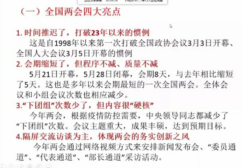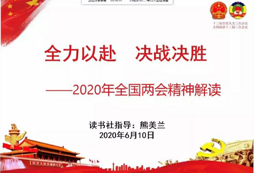 2020年是我國(guó)全面建成小康社會(huì)的關(guān)鍵年,是貫徹落實(shí)黨的方針政策關(guān)鍵之年。今年的“兩會(huì)”是承前啟后的大會(huì),這次大會(huì)不僅制定了經(jīng)濟(jì)社會(huì)發(fā)展的框架,同時(shí)制定了年中國(guó)經(jīng)濟(jì)社會(huì)發(fā)展的具體路線圖。為了學(xué)習(xí)貫徹兩會(huì)精神,2020年6月10月晚7:00熊美蘭老師在QQ群視頻會(huì)議平臺(tái)上開(kāi)展了2020年全國(guó)兩會(huì)精神解讀專題講座。
