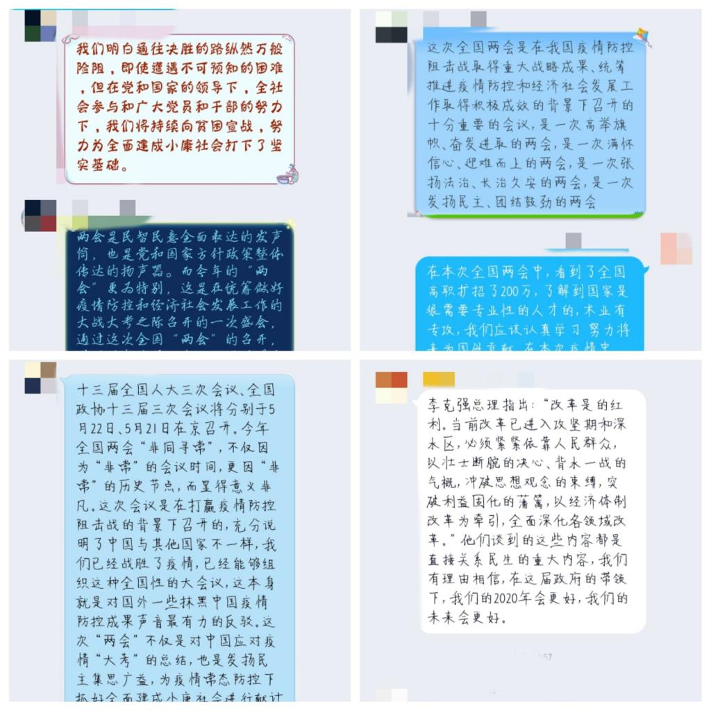 隨后,熊美蘭老師講解第三個(gè)內(nèi)容,建議大家要用奮斗的姿態(tài)貫徹兩會(huì)精神,陸游曾說(shuō):“寶劍鋒從磨礪出,梅花香自苦寒來(lái)”。努力奮斗才是時(shí)代新風(fēng)氣。熊美蘭老師讓同學(xué)們?cè)诹奶炜虬l(fā)一段自己對(duì)全國(guó)兩會(huì)的心得。身為新時(shí)代青年的我們,應(yīng)該對(duì)國(guó)家大事有所知,有所思,有所行動(dòng)。紙上得來(lái)終覺(jué)淺,絕知此事要躬行。