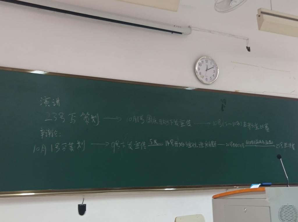 本次活動的主題是“新學期,新氣象”,這次活動,我們對于10月份即將舉辦的演講與辯論賽進行了細致的安排工作,對于活動的策劃時間,宣發(fā)工作,辯題選擇時間,以及比賽的賽制進行了具體的安排與說明。