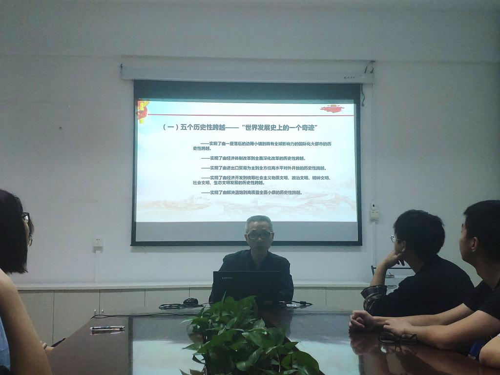 同學(xué)們簽到后,由胡濟(jì)林老師進(jìn)行了《學(xué)習(xí)習(xí)近平總書記《在深圳經(jīng)濟(jì)特區(qū)建立40周年慶祝大會(huì)上的講話》的專題匯報(bào)。胡老師首先介紹了我國(guó)設(shè)立經(jīng)濟(jì)特區(qū)的過(guò)程,接著回顧了習(xí)近平總書記的三次深圳之行,最后重點(diǎn)解讀習(xí)近平總書記《在深圳經(jīng)濟(jì)特區(qū)建立40周年慶祝大會(huì)上的講話》,主要內(nèi)容包括習(xí)近平總書記用五個(gè)“歷史性跨越”來(lái)概括深圳奇跡,總結(jié)了經(jīng)濟(jì)特區(qū)40年改革開放、創(chuàng)新發(fā)展積累的十條寶貴經(jīng)驗(yàn),對(duì)新時(shí)代經(jīng)濟(jì)特區(qū)建設(shè)作出六方面部署等。胡老師指出,深圳是改革開放后黨和人民一手締造的嶄新城市,是中國(guó)特色社會(huì)主義在一張白紙上的精彩演繹,充分彰顯中國(guó)特色社會(huì)主義制度的優(yōu)越性,我們要認(rèn)真領(lǐng)會(huì)習(xí)近平總書記的重要講話精神,學(xué)習(xí)深圳特區(qū)“闖”的精神、“創(chuàng)”的勁頭、“干”的作風(fēng),并轉(zhuǎn)化為學(xué)習(xí)上的強(qiáng)大動(dòng)力。胡老師報(bào)告結(jié)束后,同學(xué)們分享了自己的學(xué)習(xí)心得。