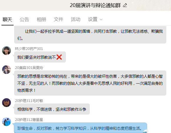2020年11月19日晚,在來朋珍、徐舒寧兩位老師的指導(dǎo)下,演講與辯論社全體成員在教學(xué)樓202展開了反邪教學(xué)習(xí)與交流活動,此次活動主要包括觀看反邪教視頻、社員交流兩個(gè)環(huán)節(jié)。