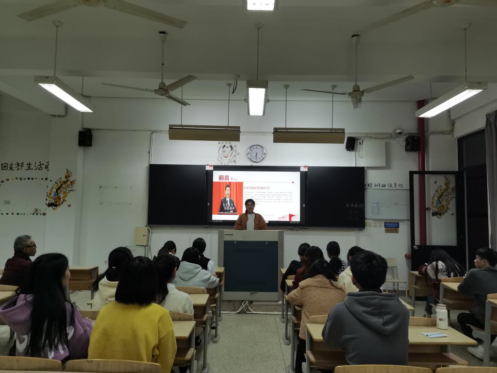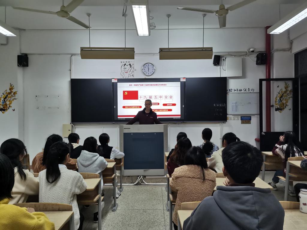同學(xué)們?cè)谶M(jìn)行簽到后,由胡濟(jì)林老師進(jìn)行《深入學(xué)習(xí)貫徹黨的十九屆五中全會(huì)精神》的專題報(bào)告,胡濟(jì)林老師先為同學(xué)們解讀會(huì)議的名稱,介紹會(huì)議召開的時(shí)間以及會(huì)議主要內(nèi)容等,接著從國(guó)內(nèi)外形勢(shì)來解讀此次會(huì)議召開的背景,重點(diǎn)講述了黨的十九屆五中全會(huì)問計(jì)于民與頂層設(shè)計(jì)相統(tǒng)一、發(fā)展為了人民、五條原則、核心要義——三個(gè)“新”等突出特點(diǎn)及亮點(diǎn),并與同學(xué)們一起回顧了“十三五”我國(guó)經(jīng)濟(jì)社會(huì)發(fā)展成就,讓同學(xué)們感悟到中國(guó)共產(chǎn)黨全心全意為人民服務(wù)的根本宗旨,感受到黨堅(jiān)強(qiáng)有力的領(lǐng)導(dǎo),在黨的領(lǐng)導(dǎo)下,我國(guó)“十三五”期間經(jīng)濟(jì)社會(huì)蓬勃發(fā)展,目前正朝著實(shí)現(xiàn)第二個(gè)百年奮斗目標(biāo)而努力拼搏。