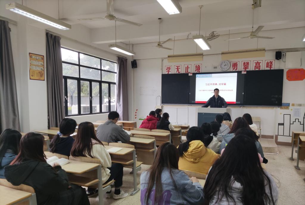 本次活動(dòng)學(xué)習(xí)的主題是《習(xí)近平用典》之“勸學(xué)篇”。江洪老師指出,學(xué)習(xí)是中國(guó)共產(chǎn)黨的優(yōu)良傳統(tǒng)和政治優(yōu)勢(shì),是中國(guó)共產(chǎn)黨人戰(zhàn)勝艱難的法寶,習(xí)近平總書(shū)記十分重視并善于學(xué)習(xí)。隨后,江老師和同學(xué)們講解了“吾生也有涯,而知也無(wú)涯”、“腹有詩(shī)書(shū)氣自華”、“學(xué)而不思則罔,思而不學(xué)則殆”等習(xí)近平總書(shū)記在不同場(chǎng)合講話中使用過(guò)的典故,教導(dǎo)同學(xué)們要樹(shù)立積極進(jìn)取的人生觀,努力學(xué)習(xí),善學(xué)、樂(lè)學(xué),在學(xué)習(xí)中不斷提高自己。