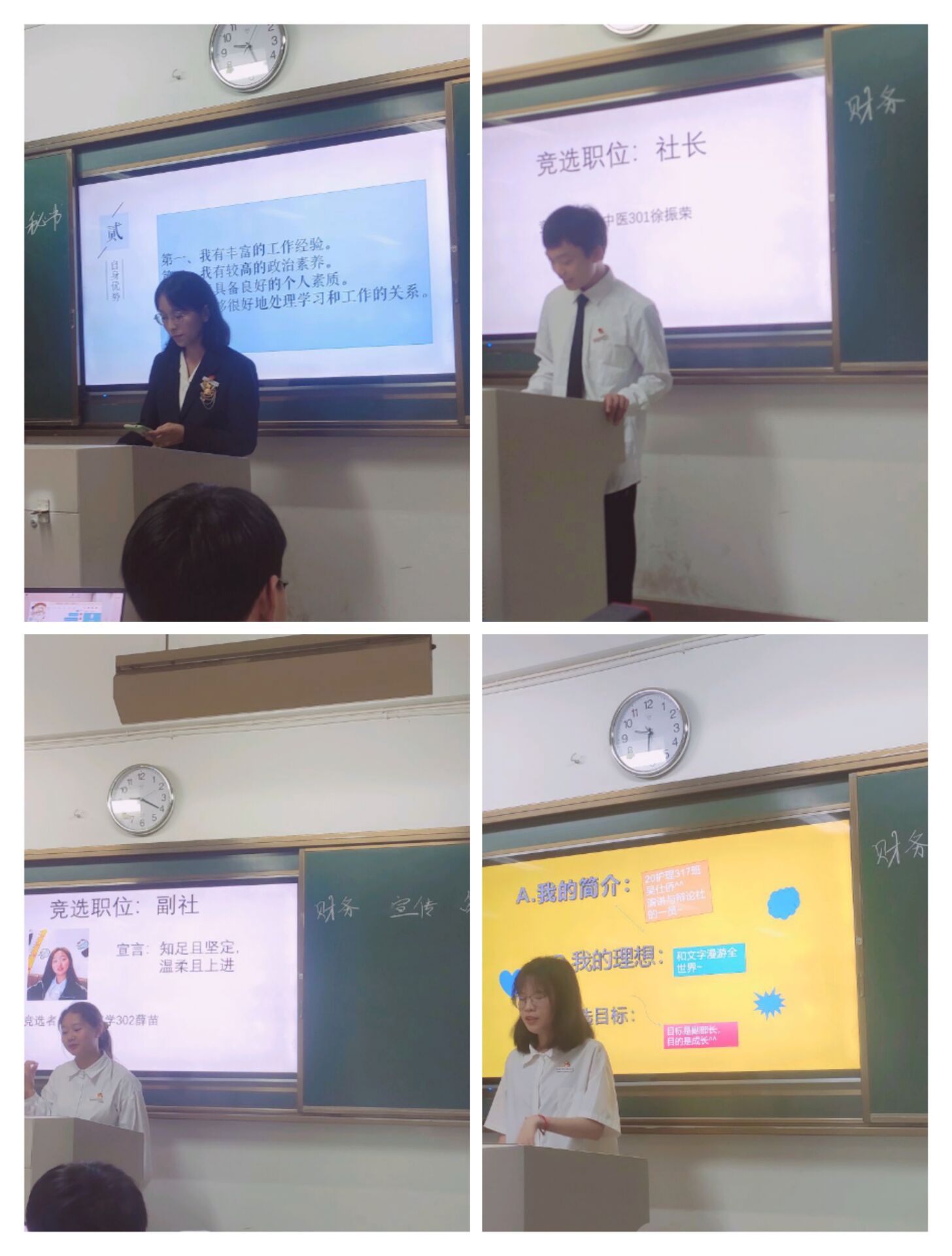 社團(tuán)成員們積極、踴躍地參與了競(jìng)選,競(jìng)選演講過程中他們大放異彩,滿懷激情的抒發(fā)所知所感。他們自主且勇敢,謙虛而不失自信,在講臺(tái)上妙語(yǔ)連珠,侃侃而談,表現(xiàn)出自己對(duì)社團(tuán)發(fā)展的想法,他們精彩絕倫的言辭令觀眾不禁為他們鼓起了陣陣熱烈的掌聲!經(jīng)過一個(gè)多小時(shí)的激烈競(jìng)選,公平投票和公開唱票后,演講與辯論社的新一屆成員在老師的見證下選出。前任社長(zhǎng)宣布新一屆社長(zhǎng)、副社長(zhǎng)及各干事的名單,并進(jìn)行了簡(jiǎn)單的工作交接。
