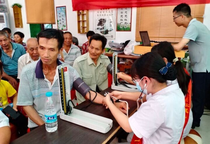 圖為實(shí)踐隊(duì)員們給老人們測(cè)量血壓。中國(guó)青年網(wǎng)通訊員 陳琳琳 攝