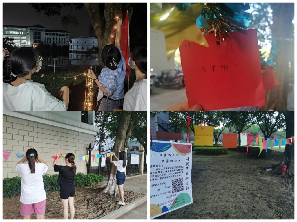 本次活動,為避免人員聚集,由工作人員提前布置現(xiàn)場,且分時間在規(guī)定地點設(shè)置謎題,活動人員在規(guī)定時間內(nèi)將猜出的燈謎取下,將謎題和謎底拍照發(fā)送到活動QQ群,工作人員核對答案?;顒咏Y(jié)束后,工作人員統(tǒng)計并核對答對數(shù)量,聯(lián)系獲獎人員拿取獎品。