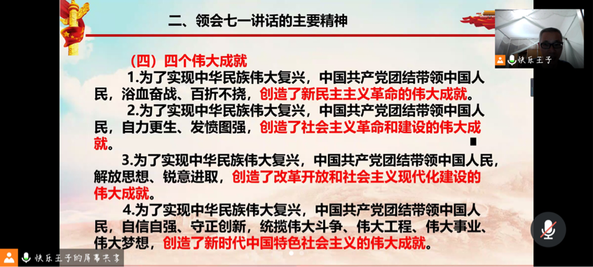 為了更好地領會習近平總書記在慶祝中國共產黨成立100周年大會上的重要講話精神,2021年9月20日晚上,習近平新時代中國特色社會主義思想讀書社宣講團在騰訊會議開展專題學習活動,此次活動主要由胡濟林老師宣講。