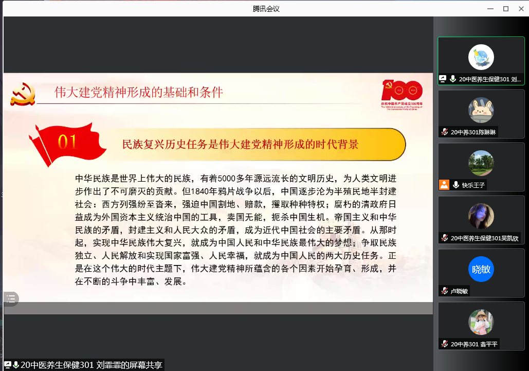 2021年9月27日下午,習(xí)近平新時代中國特色社會主義思想讀書社宣講團(tuán)在馬克思主義學(xué)院胡濟(jì)林老師的組織下,為20中醫(yī)養(yǎng)生保健301班、20營養(yǎng)301班開展線上學(xué)習(xí)“偉大建黨精神----中國共產(chǎn)黨的精神之源走”專題宣講。