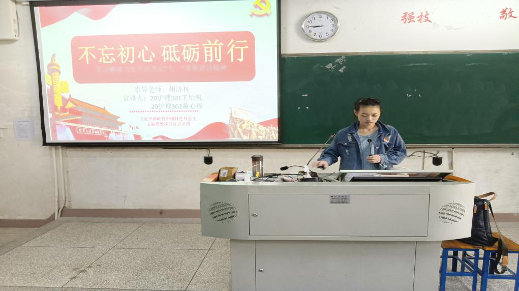 2021年11月5日下午,習(xí)近平新時代中國特色社會主義思想讀書社宣講團(tuán)在胡濟(jì)林老師的組織下,到醫(yī)學(xué)技術(shù)系111教室為21檢驗501班、21影像501班開展“不忘初心、砥礪前行”專題宣講。