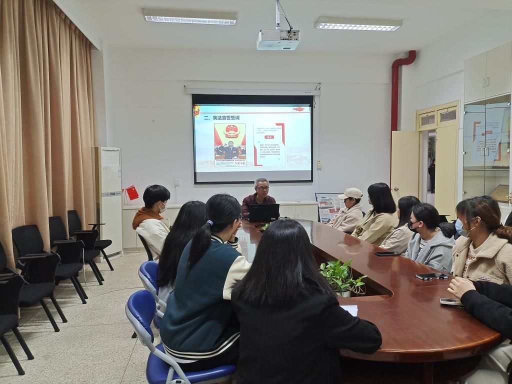 胡濟(jì)林首先帶領(lǐng)同學(xué)們觀看《國家憲法日》宣傳片,讓學(xué)生對憲法日的由來與內(nèi)涵有了初步的了解。接著胡濟(jì)林作《學(xué)習(xí)宣傳憲法弘揚(yáng)憲法精神》的專題報(bào)告,從國家憲法日的設(shè)立入手,給同學(xué)們介紹了憲法的概念、憲法宣誓制度、憲法的主要特征、公民的基本權(quán)利和基本義務(wù),強(qiáng)調(diào)憲法在中國特色社會主義法律體系的決定性作用。胡濟(jì)林號召同學(xué)們要學(xué)好憲法,學(xué)習(xí)宣傳好習(xí)近平法治思想,大力弘揚(yáng)社會主義法治精神,推進(jìn)國家治理體系和治理能力現(xiàn)代化。