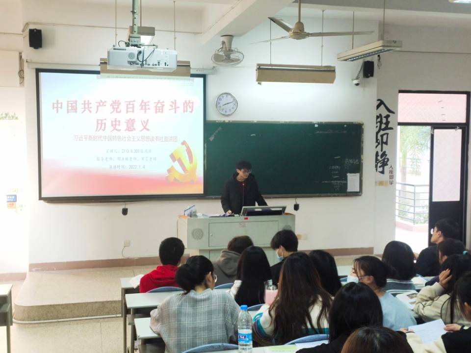 為引導(dǎo)青年學(xué)生了解中國共產(chǎn)黨百年來的輝煌成就,2022年1月4日,習(xí)近平新時代中國特色社會主義思想讀書社宣講團(tuán)在胡濟(jì)林、羅蕓老師的指導(dǎo)下,在教學(xué)樓209為21臨床301班、21臨床302班、21康復(fù)303班開展“中國共產(chǎn)黨百年奮斗的歷史意義”專題宣講。