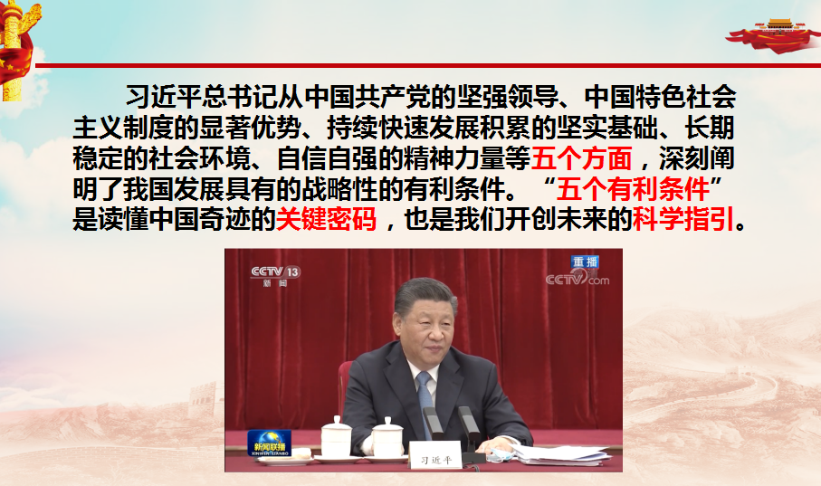 宣講伊始,胡濟林分析了“五個有利條件”相互間的關(guān)系,指出今天中國改革發(fā)展的偉大成就源于中國共產(chǎn)黨的堅強領(lǐng)導(dǎo)。只有在黨的堅強領(lǐng)導(dǎo)下,其他四個有利條件才能產(chǎn)生,沒有黨的堅強領(lǐng)導(dǎo),就談不上其他四個有利條件。接著分別就中國共產(chǎn)黨的堅強領(lǐng)導(dǎo)、中國特色社會主義制度的顯著優(yōu)勢、持續(xù)快速發(fā)展積累的堅實基礎(chǔ)、長期穩(wěn)定的社會環(huán)境、自信自強的精神力量等五個方面進行詳細的解讀,講授中,胡濟林用詳實的數(shù)據(jù)和豐富的案例,引導(dǎo)同學(xué)們深刻把握我國發(fā)展的五個戰(zhàn)略性“有利條件”,勉勵大家踔厲奮發(fā)、篤行不怠,刻苦學(xué)習(xí),勇于拼搏,以優(yōu)異的成績迎接黨的二十大勝利召開。