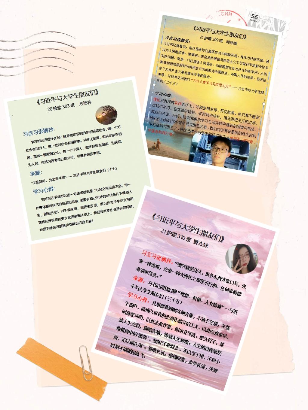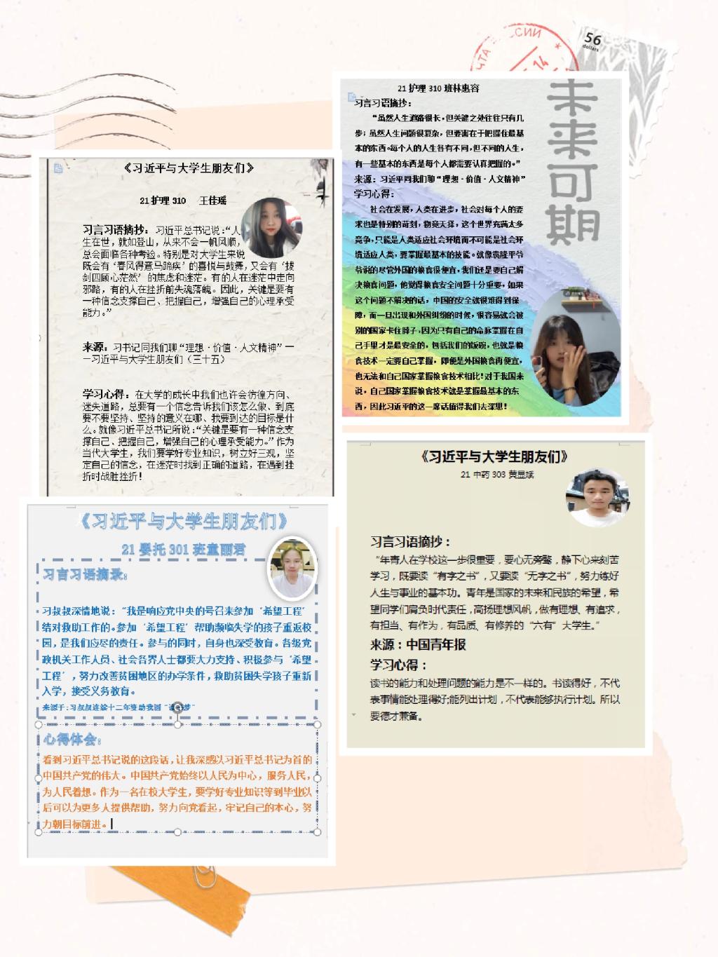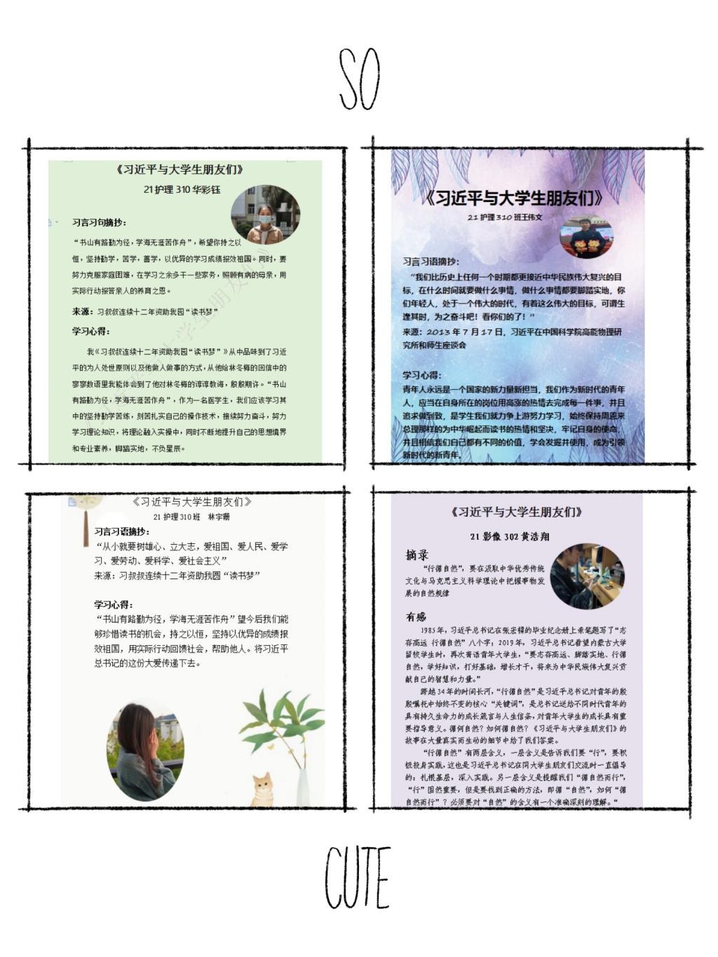 社員們從《習(xí)近平與大學(xué)生朋友們》包含的25篇采訪實(shí)錄中摘錄最喜歡的習(xí)言習(xí)語,并進(jìn)行心得交流和作品展示。以下是部分隊員的作品展示: