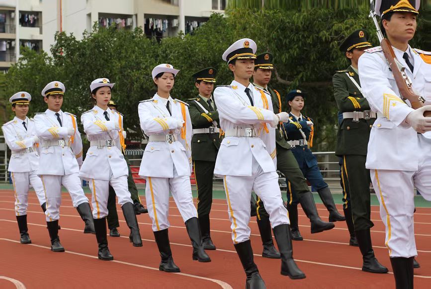 首先,在鏗鏘有力的步伐和整齊嘹亮的口號聲中,護(hù)旗手們護(hù)送鮮艷的五星紅旗走向升旗臺。