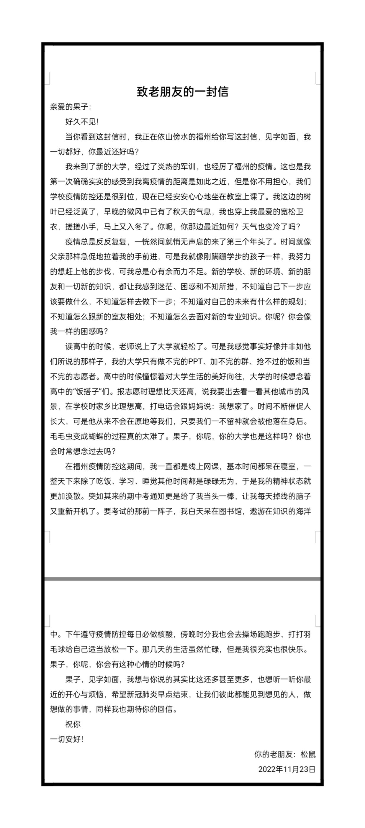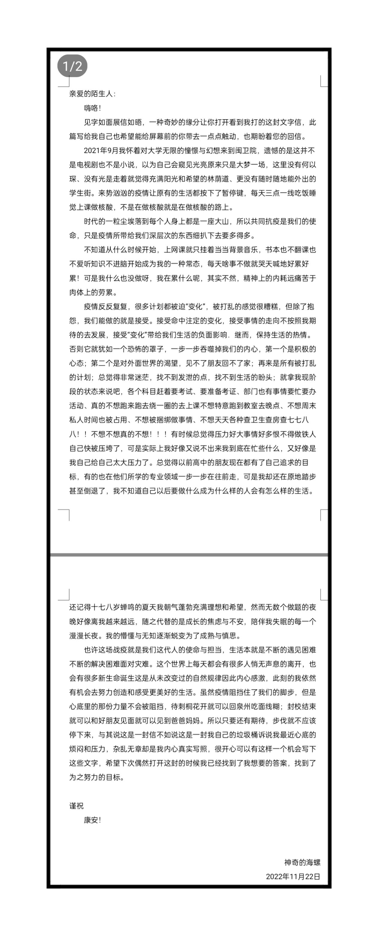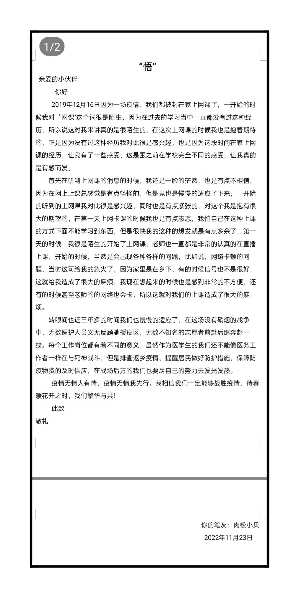 勠力同心,戰(zhàn)“疫”必勝。在來朋珍、徐舒寧兩位老師的指導(dǎo)下,本次活動舉辦圓滿成功。同學(xué)們用指尖的鍵盤敲打出積蓄已久的“心里話”,以“漂流箋”的形式來緩解疫情下同學(xué)們的心理,引導(dǎo)同學(xué)們發(fā)出自己的聲音:“我們終將打贏疫情這場戰(zhàn)役?!薄皥猿志褪莿倮?!”