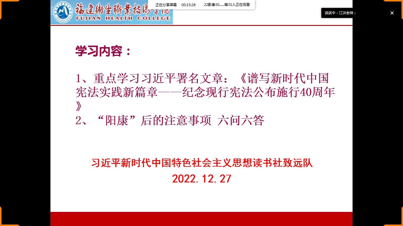 為加強學生憲法意識、弘揚憲法精神、提升學生法治素養(yǎng),2022年12月27日,習近平新時代中國特色社會主義思想讀書社致遠隊在江洪老師的組織下,線上開展學習習近平總書記于2022年12月19日發(fā)表的重要文章《譜寫新時代中國憲法實踐新篇章——紀念現(xiàn)行憲法公布施行40周年》。讀書社致遠隊新老成員30多人按時參加了活動。