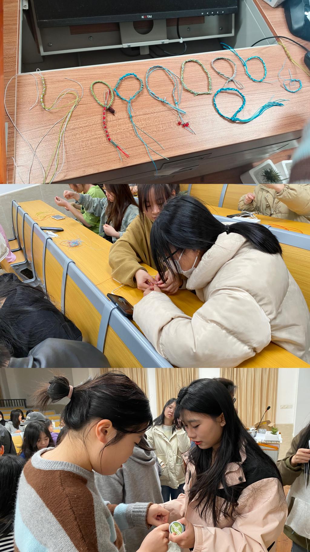 日月陽(yáng)陰兩均天,玄鳥(niǎo)不辭桃花寒。本次活動(dòng)以“春”為主題,五人一組編織手繩,領(lǐng)取手繩材料后,在規(guī)定時(shí)間內(nèi)自由發(fā)揮編織完成作品。