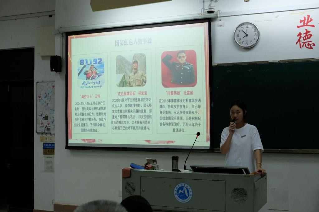 本次宣講小組成員是23中藥301班的陳瑩和王紫欣,宣講人是陳瑩,她宣講的主題是“強國復(fù)興,愛我國防”。陳瑩首先向大家講述了國防建設(shè)的涵義,接著從國防紅色故事、國防事業(yè)發(fā)展歷程兩個方面來展開講述,她通過播放微視頻,讓同學(xué)們領(lǐng)略我國國防力量從追趕、并跑再到領(lǐng)跑的偉大成就,最后結(jié)合大學(xué)生實際,提出八點行動建議。胡濟林進(jìn)行精彩點評,希望同學(xué)們能通過這一宣講,堅定理想信念,為實現(xiàn)中國國防事業(yè)貢獻(xiàn)青春力量。