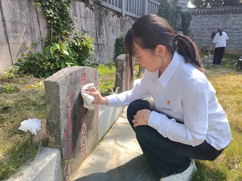 默哀后,師生代表先后發(fā)言。教師代表胡濟(jì)林強(qiáng)調(diào)要銘記歷史,珍惜來之不易的和平生活,將紅色精神代代相傳,為建設(shè)中國特色社會主義現(xiàn)代化強(qiáng)國而奮斗。學(xué)生代表林俐表示要向革命先烈學(xué)習(xí),傳承紅色精神,努力學(xué)習(xí),做社會主義建設(shè)者和接班人。 隨后,同學(xué)們紛紛拿起工具,清掃陵園地面的落葉與雜物,擦拭烈士墓碑,以實際行動表達(dá)對先烈的敬重。