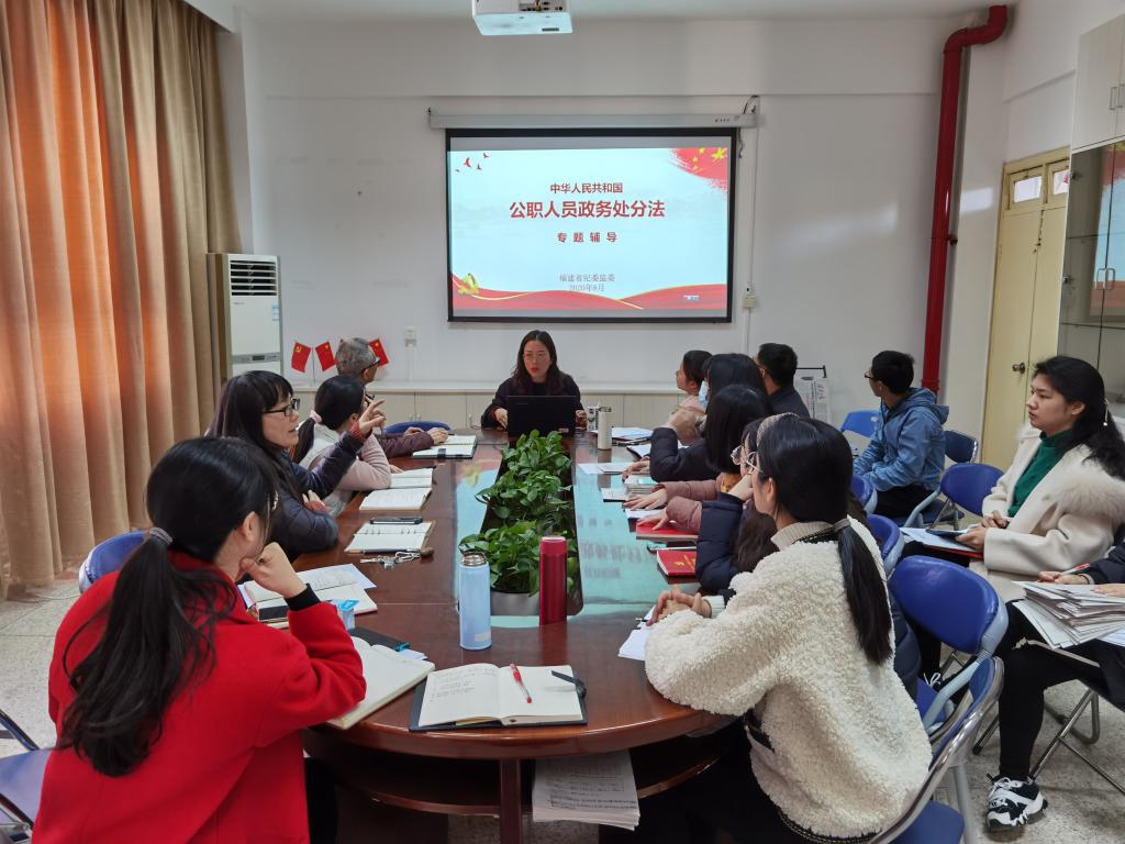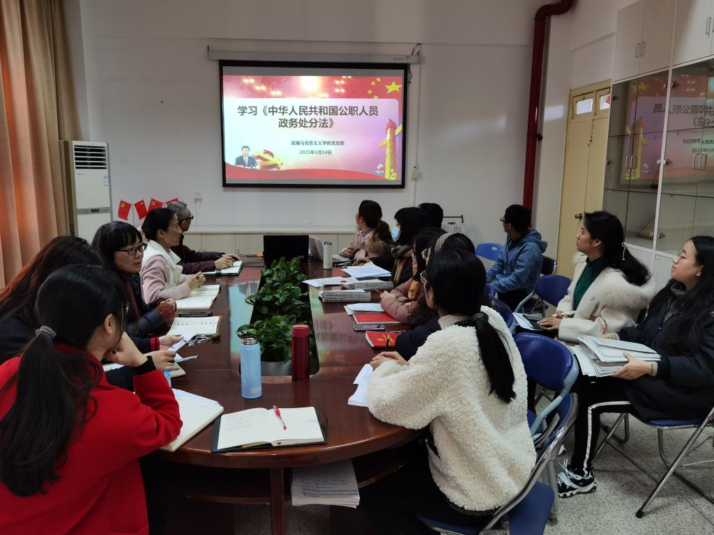 為切實領(lǐng)會、準(zhǔn)確把握《中華人民共和國公職人員政務(wù)處分法》(以下簡稱《政務(wù)處分法》)的新精神、新要求,2021年1月14日下午,直屬馬克思主義學(xué)院黨支部組織全體黨員在行政樓107會議室專題學(xué)習(xí)《政務(wù)處分法》。學(xué)習(xí)會由黨支部書記熊美蘭同志主持,支部全體黨員同志參加了學(xué)習(xí)會。