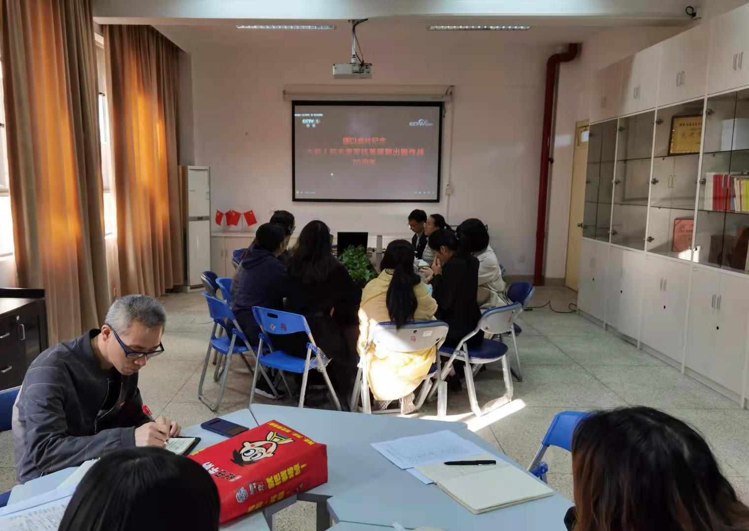 為深入貫徹落實(shí)習(xí)近平總書記在紀(jì)念中國(guó)人民志愿軍抗美援朝出國(guó)作戰(zhàn)70周年大會(huì)上的重要講話精神,深入開(kāi)展“四史”學(xué)習(xí)教育,大力弘揚(yáng)偉大的抗美援朝精神,2020年12月3日,直屬馬克思主義學(xué)院黨支部開(kāi)展主題黨日活動(dòng),組織支部全體教師黨員在行政樓107會(huì)議室集中觀看學(xué)習(xí)了專題紀(jì)錄片《為了和平》。
