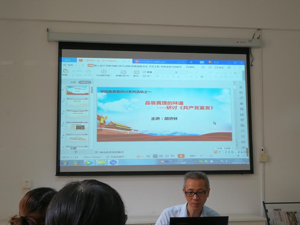 接著,大家一起學(xué)習(xí)了《黨政機(jī)關(guān)厲行節(jié)約反對浪費(fèi)條例》和《思政課是落實(shí)立德樹人根本任務(wù)的關(guān)鍵課程》,新任思政課教師羅蕓就學(xué)習(xí)《思政課是落實(shí)立德樹人根本任務(wù)的關(guān)鍵課程》交流了3點(diǎn)學(xué)習(xí)心得,一是不忘立德樹人初心;二是以“六個(gè)要”為標(biāo)準(zhǔn)找差距;三是按照“八個(gè)相統(tǒng)一”的要求積極參與思政課改革。學(xué)習(xí)完后,開展研學(xué)馬克思主義經(jīng)典原著活動(dòng),第一講由概論教研室主任胡濟(jì)林老師主講《品嘗真理的味道——研討<共產(chǎn)黨宣言>》。