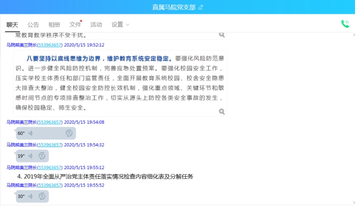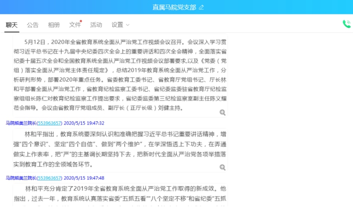 5月15日晚上7點(diǎn)30分,直屬馬克思主義學(xué)院黨支部在QQ群線上召開學(xué)習(xí)會(huì)暨新冠肺炎疫情防控工作會(huì)?;顒?dòng)由馬院黨支部書記熊美蘭主持,馬克思主義學(xué)院全體黨員參加了活動(dòng)。
