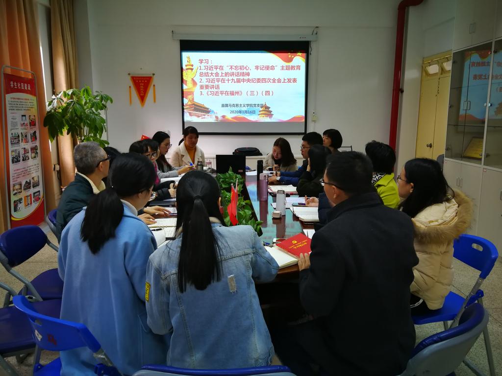 2020年1月16日上午,直屬馬克思主義學(xué)院黨支部在行政樓107會議室舉行集體學(xué)習(xí)會議,集中學(xué)習(xí)習(xí)近平在“不忘初心、牢記使命”主題教育總結(jié)大會上的講話精神、習(xí)近平總書記在十九屆中央紀委四次全會上的重要講話、《習(xí)近平在福州》(三)(四)。會議由直屬馬克思主義學(xué)院黨支部書記熊美蘭主持,黨支部全體黨員參加了會議。