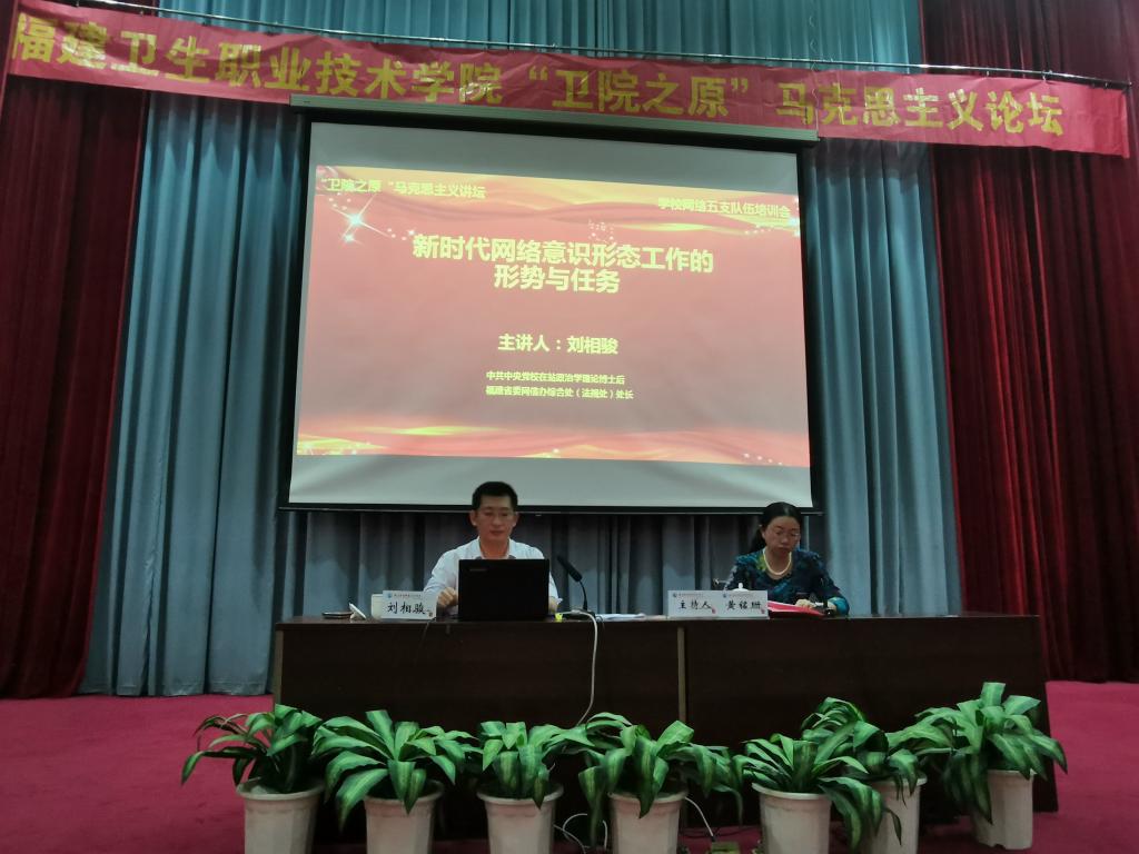 為扎實(shí)推進(jìn)“不忘初心、牢記使命”主題教育,深入學(xué)習(xí)“專(zhuān)題六:主動(dòng)擔(dān)當(dāng)作為,凝聚發(fā)展動(dòng)力”,2019年10月24日下午,我校“衛(wèi)院之原”馬克思主義講壇在學(xué)術(shù)報(bào)告廳舉行。本次講壇邀請(qǐng)福建省委網(wǎng)信辦綜合處(法規(guī)處)劉相駿處長(zhǎng)為我校師生做“新時(shí)代網(wǎng)絡(luò)意識(shí)形態(tài)工作的形勢(shì)和任務(wù)”的專(zhuān)題講座。講座由福建衛(wèi)生職業(yè)技術(shù)學(xué)院副院長(zhǎng)黃銘珊主持,各系部黨總支副書(shū)記、各黨總支專(zhuān)職組織員、學(xué)生黨支部書(shū)記、輔導(dǎo)員、馬院全體教師、醫(yī)學(xué)技術(shù)學(xué)系學(xué)生代表、臨床醫(yī)學(xué)系學(xué)生代表以及社團(tuán)學(xué)生代表共420人參加了此次會(huì)議。