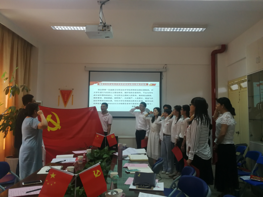 首先,在直屬馬克思主義學院黨支部江洪同志的帶領下,馬克思主義學院全體教師黨員鄭重地舉起右手,面向黨旗,莊嚴宣誓,重溫入黨誓詞,表達對黨忠誠,積極工作,為共產(chǎn)主義事業(yè)奮斗終身的決心。入黨宣誓儀式后,進行思想政治理論課教師宣誓。在馬克思主義學院名譽院長魏立娜教授的帶領下,馬克思主義學院全體思想政治理論課教師舉起右手,莊嚴宣誓,鄭重承諾擔負好落實新時代思想政治理論課教師的光榮職責和使命。