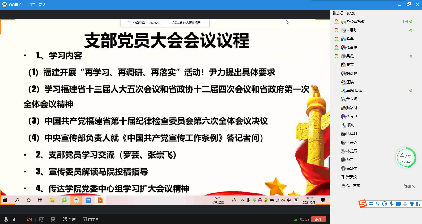 2021年2月8日,直屬馬克思主義學(xué)院黨支部在線(xiàn)召開(kāi)支部黨員大會(huì),傳達(dá)并學(xué)習(xí)學(xué)院黨委中心組學(xué)習(xí)(擴(kuò)大)會(huì)議精神,并結(jié)合2021年馬克思主義學(xué)院宣傳工作進(jìn)行部署,會(huì)議由直屬馬克思主義學(xué)院黨支部副書(shū)記來(lái)朋珍主持,支部全體黨員參加會(huì)議。