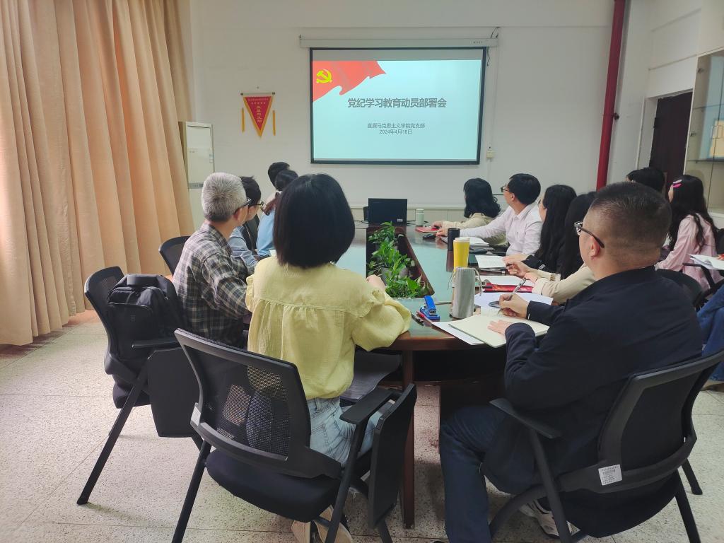 為全面落實(shí)《關(guān)于在全黨開展黨紀(jì)學(xué)習(xí)教育的通知》的要求,2024年4月18日,直屬馬克思主義學(xué)院黨支部在厚德樓107會議室開展黨紀(jì)學(xué)習(xí)教育動(dòng)員部署會。會議由黨支部書記熊美蘭主持,支部全體黨員參加。