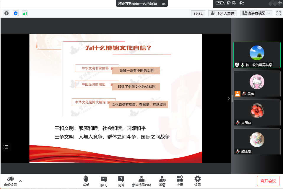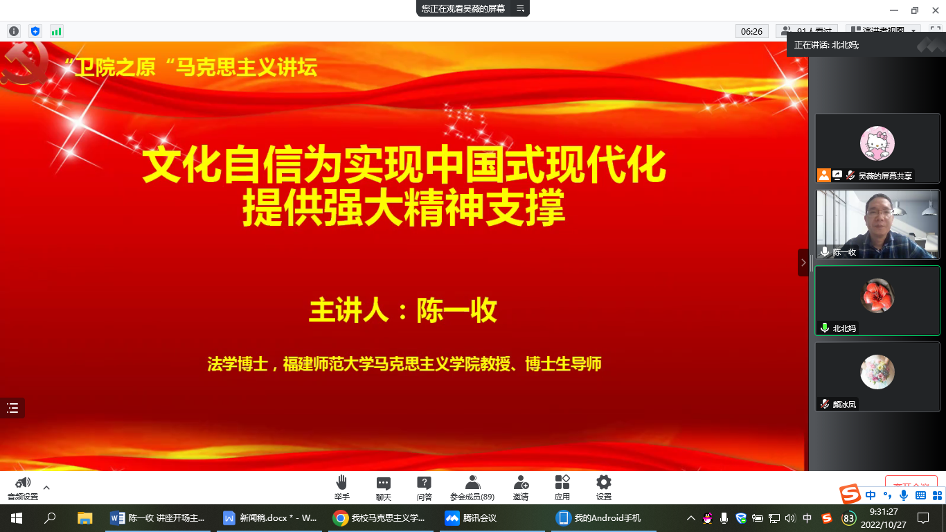 為幫助我校師生學(xué)習(xí)貫徹黨的二十大精神,從中華優(yōu)秀傳統(tǒng)文化中汲取思想精華,從百年黨史中感悟文化自信,2022年10月27日,我校馬克思主義學(xué)院邀請(qǐng)福建師范大學(xué)馬克思主義學(xué)院教授、博士生導(dǎo)師陳一收作題為《文化自信為實(shí)現(xiàn)中國(guó)式現(xiàn)代化提供強(qiáng)大精神支撐》專題講座。講座由馬克思主義學(xué)院副院長(zhǎng)來(lái)朋珍主持,全體思政課教師及醫(yī)學(xué)技術(shù)系學(xué)生代表以線上方式參與。