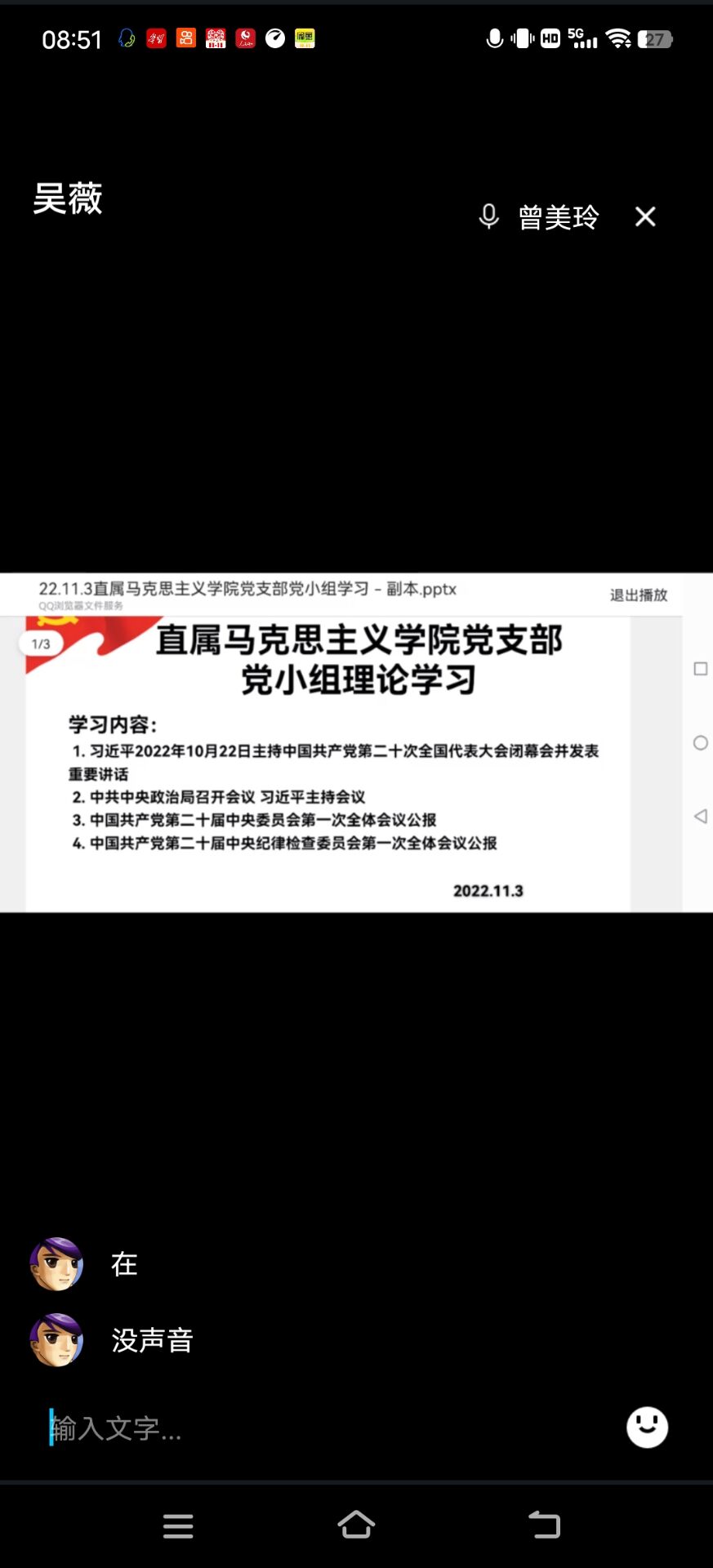 2022年11月13日上午,直屬馬克思主義學(xué)院黨支部在線上開展黨小組理論學(xué)習(xí)。羅蕓、來(lái)朋珍分別主持第一黨小組、第二黨小組的理論學(xué)習(xí)。