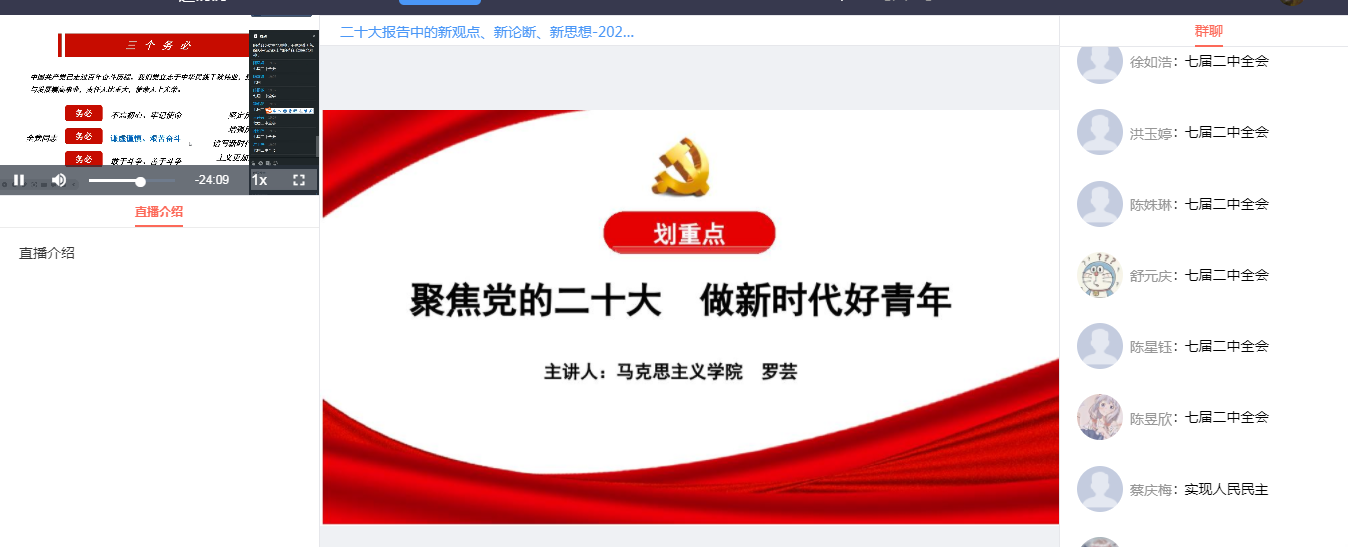 2022年11月9日,習近平新時代中國特色社會主義思想讀書社原夢隊、21級黨史課選課學生代表齊聚云端,馬克思主義學院羅蕓老師開展了以“聚焦黨的二十大 做新時代好青年”為主題的宣講。此次活動是馬克思主義學院學習貫徹黨的二十大精神系列宣講活動之一。