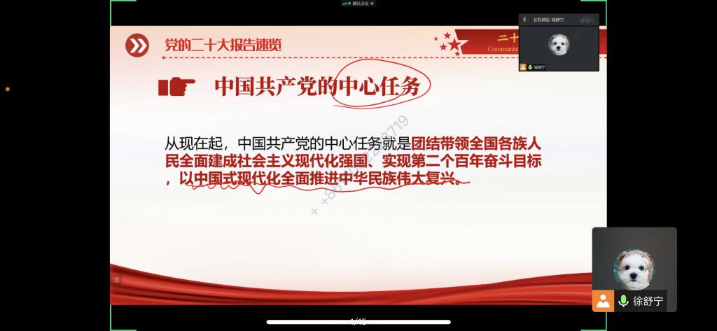聆聽報(bào)告,展望未來。中國人民的前進(jìn)動(dòng)力更加澎湃、奮斗精神更加昂揚(yáng)、必勝信念更加堅(jiān)定。徐舒寧從1到10,和同學(xué)們一起學(xué)習(xí)黨的二十大報(bào)告中的關(guān)鍵論述。即一個(gè)中任務(wù)、兩步走、三個(gè)務(wù)必、“四個(gè)自信”、“五個(gè)必由之路”、六個(gè)堅(jiān)持、七個(gè)安全、八項(xiàng)規(guī)定、中國式現(xiàn)代化九個(gè)方面的要求、十個(gè)加快建設(shè)。同時(shí)向同學(xué)們分享了幾點(diǎn)學(xué)習(xí)領(lǐng)會黨的二十大精神的心得,提出廣大青年要堅(jiān)定不移聽黨話、跟黨走,懷抱夢想又腳踏實(shí)地,敢想敢為又善作善成,立志做有理想、敢擔(dān)當(dāng)、能吃苦、肯奮斗的新時(shí)代好青年,讓青春在全面建設(shè)社會主義現(xiàn)代化國家的火熱實(shí)踐中綻放絢麗之花。