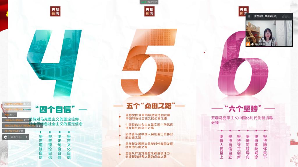 2022年11月9日,傳統(tǒng)節(jié)日研習(xí)社、21級新中國史選課學(xué)生代表齊聚云端,馬克思主義學(xué)院顏冰鳳老師開展了以“黨的二十大報告中的新觀點、新論斷、新思想”為主題的宣講。此次活動是馬克思主義學(xué)院學(xué)習(xí)貫徹黨的二十大精神系列宣講活動之一。