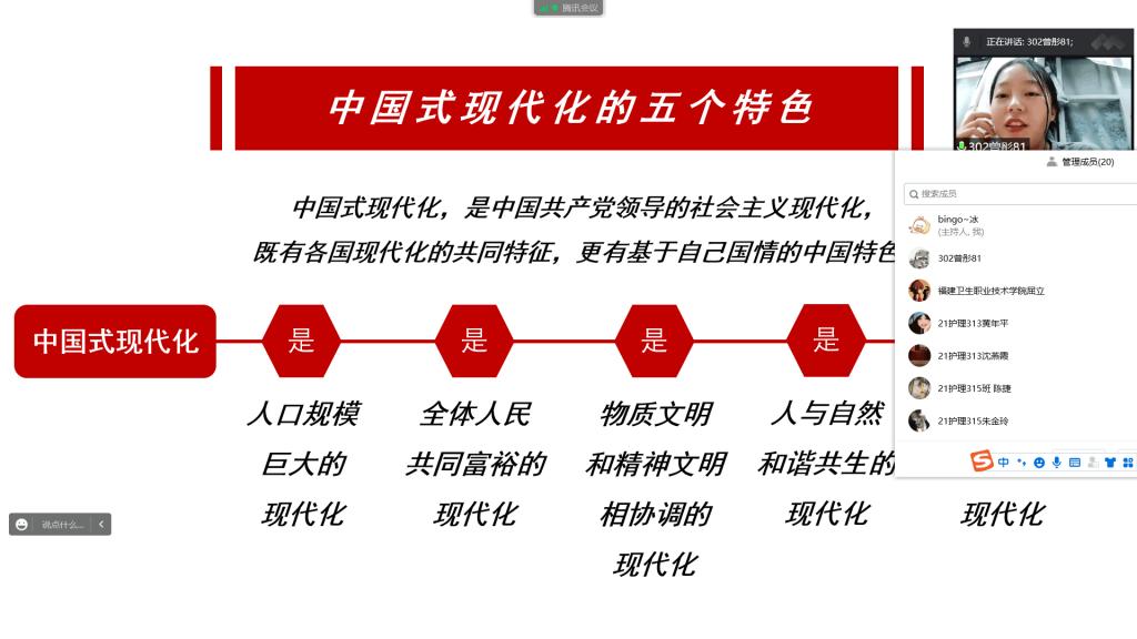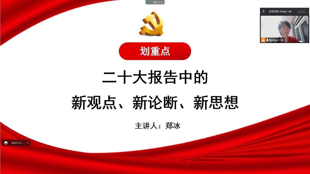2022年11月16日,習(xí)近平新時(shí)代中國(guó)特色社會(huì)主義思想讀書(shū)社夢(mèng)之隊(duì)的隊(duì)員們?cè)隍v訊會(huì)議平臺(tái)上聆聽(tīng)了鄭冰老師進(jìn)行的題為“黨的二十大報(bào)告中的新觀點(diǎn)、新論斷、新思想”的宣講。此次活動(dòng)是馬克思主義學(xué)院學(xué)習(xí)貫徹黨的二十大精神系列宣講活動(dòng)之一。