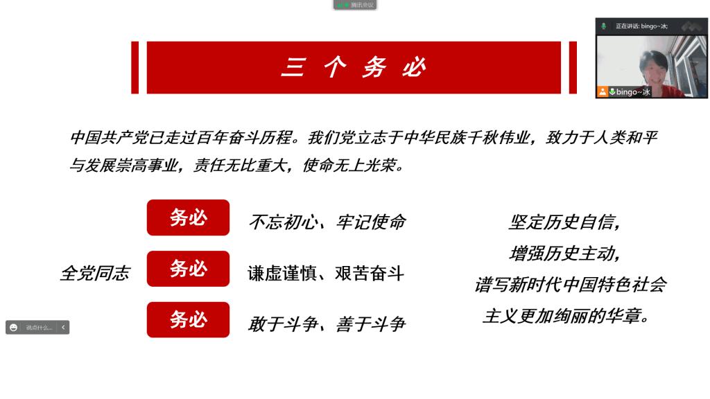 鄭冰首先介紹了大會(huì)的主題,引人入勝,明確同學(xué)們的學(xué)習(xí)方向。講述了中國(guó)共產(chǎn)黨走過(guò)的百年奮斗歷程,以及中國(guó)共產(chǎn)黨立志于中華民族千秋偉業(yè),致力于人類(lèi)和平與發(fā)展的無(wú)上光榮的使命,據(jù)此引出全黨同志的三個(gè)務(wù)必和黨十年來(lái)所干的三件大事以及黨的中心任務(wù)。通過(guò)五個(gè)特色的描述,讓我們明確何為中國(guó)式現(xiàn)代化,以及前進(jìn)道路上我們必須牢牢把握的五個(gè)重大原則等重要內(nèi)容。