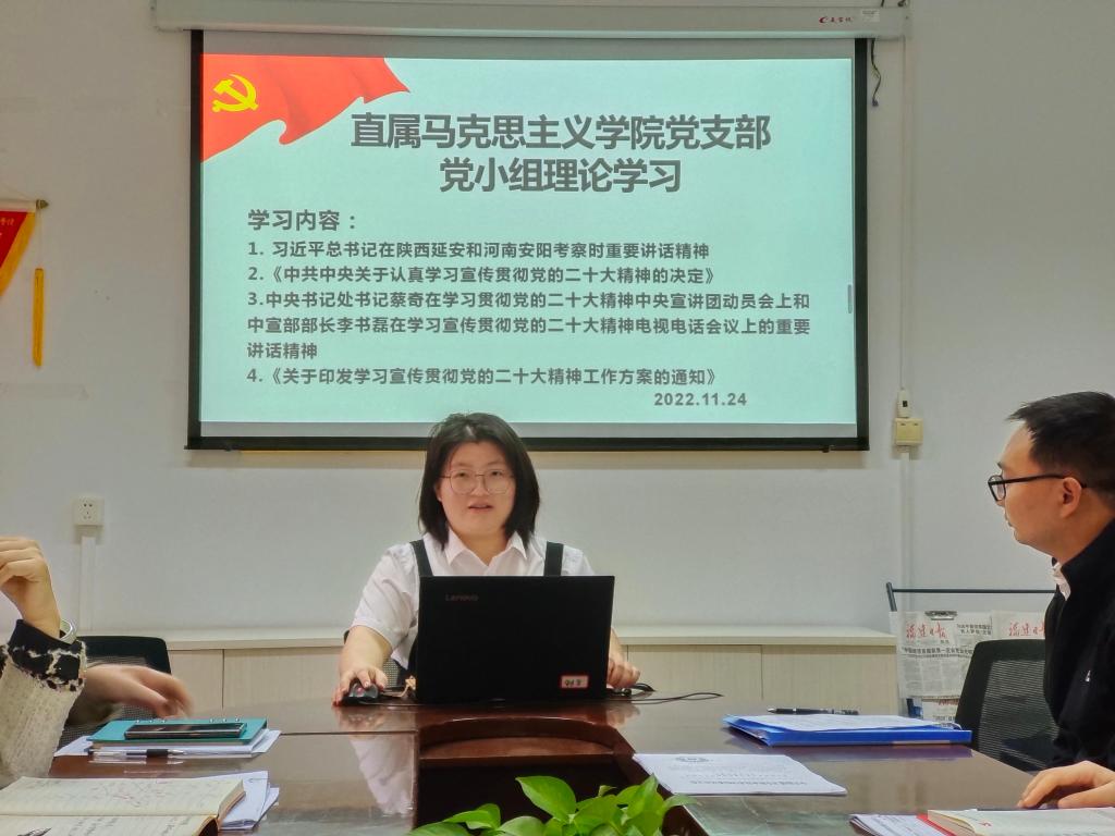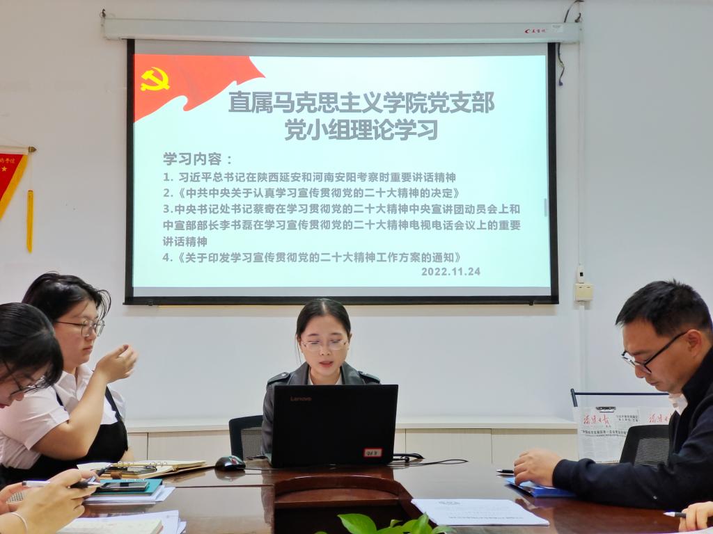 2022年11月24日,直屬馬克思主義學(xué)院黨支部學(xué)習(xí)了習(xí)近平總書(shū)記在陜西延安和河南安陽(yáng)考察時(shí)重要講話(huà)精神、《中共中央關(guān)于認(rèn)真學(xué)習(xí)宣傳貫徹黨的二十大精神的決定》、中央書(shū)記處書(shū)記蔡奇在學(xué)習(xí)貫徹黨的二十大精神中央宣講團(tuán)動(dòng)員會(huì)上和中宣部部長(zhǎng)李書(shū)磊在學(xué)習(xí)宣傳貫徹黨的二十大精神電視電話(huà)會(huì)議上的重要講話(huà)精神,以及傳達(dá)學(xué)習(xí)學(xué)院《關(guān)于印發(fā)學(xué)習(xí)宣傳貫徹黨的二十大精神工作方案的通知》等內(nèi)容。本次學(xué)習(xí)活動(dòng)由來(lái)朋珍同志主持。
