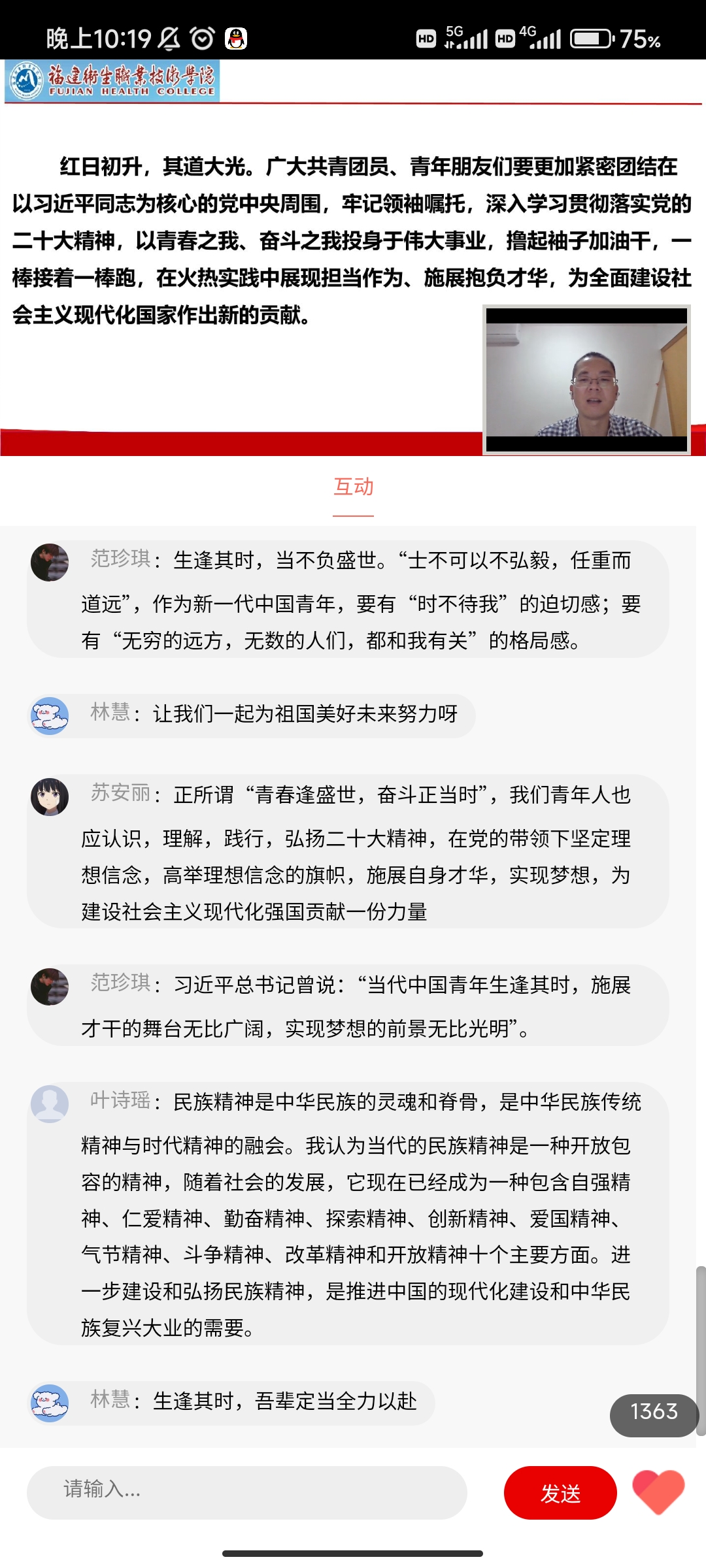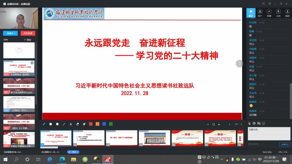 2022年11月28日晚,習(xí)近平新時(shí)代中國(guó)特色社會(huì)主義思想讀書社致遠(yuǎn)隊(duì)通過(guò)學(xué)習(xí)通線上平臺(tái)集中開(kāi)展“永遠(yuǎn)跟黨走 奮進(jìn)新征程——學(xué)習(xí)黨的二十大精神”主題宣講活動(dòng),由指導(dǎo)老師江洪主講,2022級(jí)讀書社致遠(yuǎn)隊(duì)新老成員30多人按時(shí)參加了活動(dòng)。