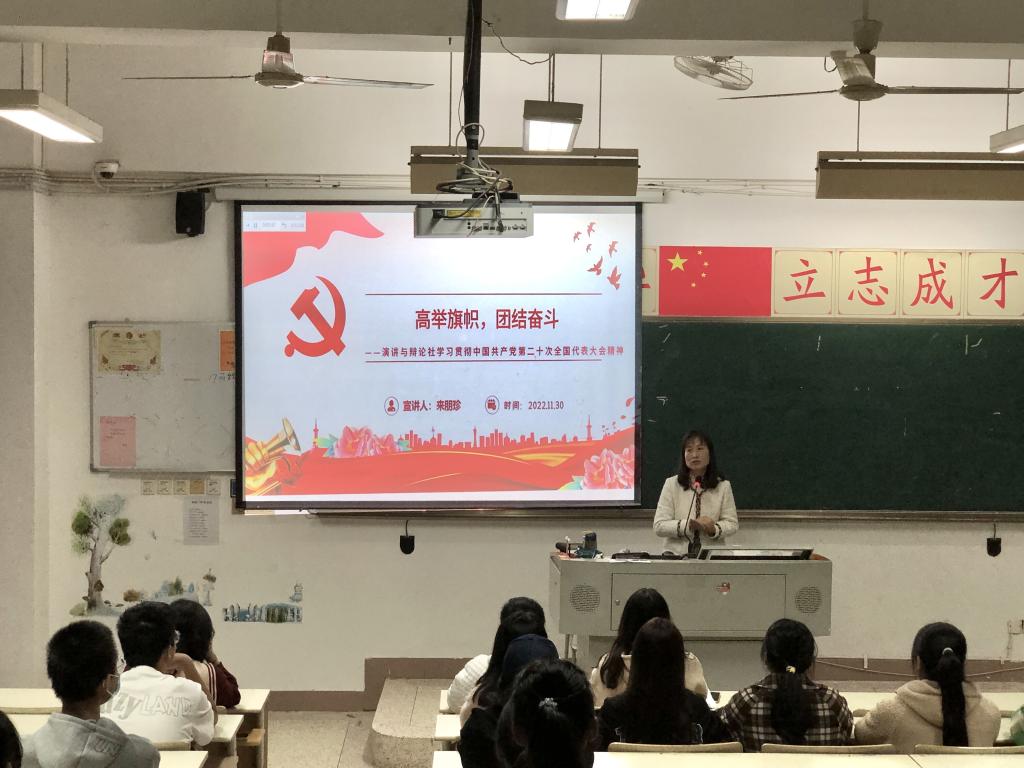 傳精神火種,聚奮進力量。為深入學(xué)習(xí)宣傳貫徹黨的二十大精神,2022年11月30日,演講與辯論社指導(dǎo)老師來朋珍在教學(xué)樓315教室對全體社團成員開展了“高舉旗幟奮斗團結(jié)”為主題的學(xué)習(xí)黨的二十大精神宣講。