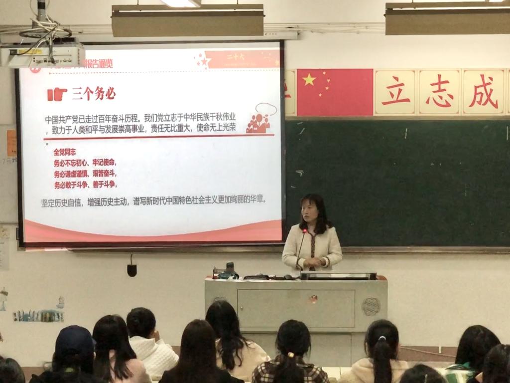 來朋珍老師從“三個務(wù)必”“五個重大原則”“五個必由之路”等方面詳細(xì)介紹了黨的二十大報告的一系列重要論點,引導(dǎo)同學(xué)們深入學(xué)習(xí)貫徹黨的二十大精神,深刻理解黨的二十大召開的重大意義,同時也激勵同學(xué)們更加緊密地團結(jié)在以習(xí)近平同志為核心的黨中央周圍,高舉中國特色社會主義偉大旗幟,堅定道路自信、理論自信、制度自信、文化自信,為全面建設(shè)社會主義現(xiàn)代化國家、全面推進中華民族偉大復(fù)興而團結(jié)奮斗勇敢奮斗。