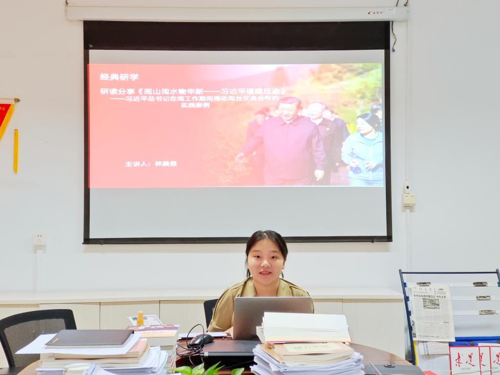 活動(dòng)中,林美辰從《閩山閩水物華新——習(xí)近平福建足跡》中關(guān)于習(xí)近平總書記在閩工作期間推動(dòng)閩臺(tái)交流合作的實(shí)踐案例進(jìn)行研學(xué)分享,指出學(xué)習(xí)習(xí)近平總書記在閩工作期間推動(dòng)閩臺(tái)交流合作的實(shí)踐案例有助于我們深入學(xué)習(xí)貫徹黨的二十大精神和新時(shí)代黨解決臺(tái)灣問題的總體方略,具有重要的理論意義和時(shí)代意義。