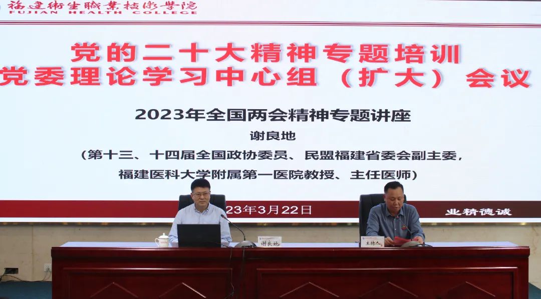 為深入學習宣傳貫徹黨的二十大精神,落實省委關(guān)于實施“深學爭優(yōu)、敢為爭先、實干爭效”行動部署,3月22日下午,黨委書記曾武祈主持召開黨委理論學習中心組(擴大)會議暨黨的二十大精神專題培訓。會議特別邀請全國政協(xié)委員謝良地來校作2023年全國兩會精神專題輔導報告。校領(lǐng)導、中層干部、專職組織員和師生黨支部書記共90余人參加本次會議。