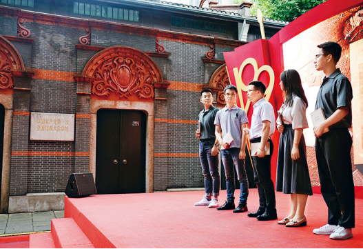 2020年6月29日,“新時(shí)代答卷人——上海市教育系統(tǒng)慶祝中國共產(chǎn)黨成立99周年暨學(xué)生愛國主義教育主題活動”在中共一大會址前舉行。來自復(fù)旦大學(xué)、同濟(jì)大學(xué)、上海建橋?qū)W院、上海市曹楊第二中學(xué)等8所學(xué)校的200余名師生代表參加活動,通過情景講述、現(xiàn)場教學(xué)、集體朗誦等形式,慶祝中國共產(chǎn)黨成立99周年,展現(xiàn)廣大上海學(xué)子的愛國情、強(qiáng)國志。圖為復(fù)旦大學(xué)師生代表在一大會址前展示情景教學(xué)。(新華社記者 劉穎/攝)