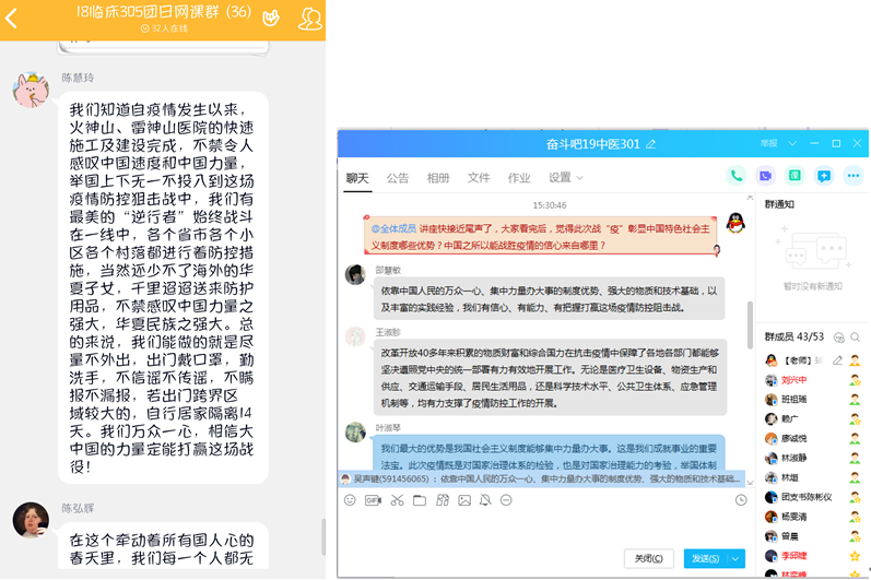 衛(wèi)院學(xué)子通過(guò)觀看疫情防控思政大課,結(jié)合自身實(shí)際,紛紛發(fā)表強(qiáng)烈感想?!白屛一匚稛o(wú)窮的是馮老師講的:我們最大的青春蛻變是走出孤芳自賞的‘小我’,走向擔(dān)當(dāng)民族復(fù)興責(zé)任的‘大我’,樹立責(zé)任意識(shí)與憂患意識(shí)。作為一名醫(yī)學(xué)生,我應(yīng)該刻苦學(xué)習(xí),積蓄報(bào)國(guó)的本領(lǐng)和才干,將來(lái)做一名大愛(ài)無(wú)疆、德技雙馨的好醫(yī)生!”19級(jí)臨床醫(yī)學(xué)專業(yè)的鐘露同學(xué)感觸頗深?!包h堅(jiān)持以人民為中心,領(lǐng)導(dǎo)和依靠?jī)|萬(wàn)人民群眾,堅(jiān)定信心、同舟共濟(jì)、科學(xué)防治、精準(zhǔn)施策,展示了中國(guó)理念、中國(guó)速度、中國(guó)規(guī)模、中國(guó)效率,充分彰顯了中國(guó)特色社會(huì)主義的制度優(yōu)勢(shì),也更加堅(jiān)定了我入黨決心,以后我要處處嚴(yán)格要求自己,爭(zhēng)取早日入黨,那時(shí)候我也可以說(shuō)‘我是黨員,我先上’!”19藥品生產(chǎn)技術(shù)專業(yè)董馨同學(xué)如是說(shuō)?!澳嫘旭Y援,白袍加身,十七年前被保護(hù)的少年們,扛起了“白衣天使”的神圣使命。在新長(zhǎng)征路上的新時(shí)代青年,要擔(dān)起實(shí)現(xiàn)民族偉大復(fù)興的責(zé)任,展現(xiàn)青年擔(dān)當(dāng)!”18級(jí)護(hù)理專業(yè)廖琳欣同學(xué)表達(dá)自己的想法?!榜R上就要畢業(yè)踏入工作崗位了,未來(lái)的我一定不忘“業(yè)精德誠(chéng)”的校訓(xùn)和老師諄諄教誨,愛(ài)崗敬業(yè),用我所學(xué)治病救人、利國(guó)利民,并且讓患者感受到我發(fā)自內(nèi)心的真善美,有時(shí)去治愈、常常去幫助、總是去安慰?!?7級(jí)學(xué)生動(dòng)情地說(shuō)。