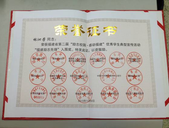 我院學生榮獲福建省第二屆“勵志校園.感動福建”優(yōu)秀學生典型宣傳活動“福建勵志先鋒”入圍獎