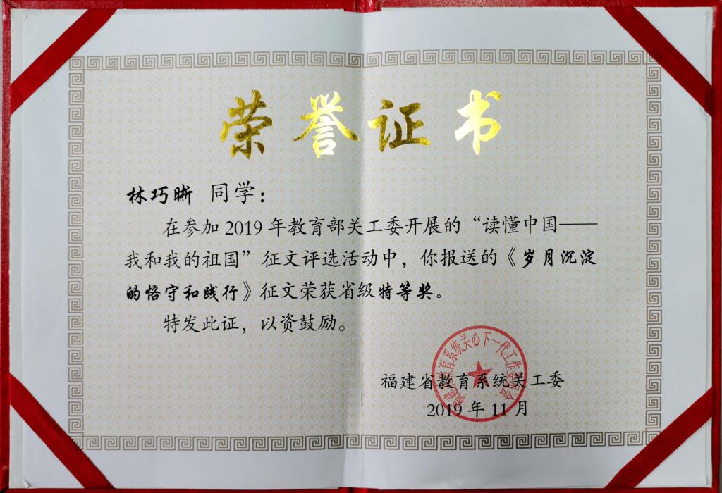 我校關(guān)工委高度重視并組織部署相關(guān)工作,擇優(yōu)報(bào)送作品。經(jīng)省教育系統(tǒng)關(guān)工委統(tǒng)一組織評(píng)選,和全省本科、高職院校并驅(qū)爭(zhēng)先。最終,由學(xué)工處指導(dǎo)、醫(yī)技系林巧晰同學(xué)撰寫(xiě)的征文《歲月沉淀的恪守和踐行》榮獲省級(jí)特等獎(jiǎng);由護(hù)理系關(guān)工委劉珍紅老師參與制作的微視頻《匠心修德 強(qiáng)技立身》榮獲省級(jí)優(yōu)秀獎(jiǎng)。我校關(guān)工委將利用獲獎(jiǎng)?wù)魑暮臀⒁曨l寶貴資源,讓全院青年學(xué)生,從中受到更多教育和感悟。