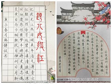 除了誦讀抗疫詩文外,同學們還通過設(shè)計作品傳遞對革命先烈以及在抗擊新冠肺炎疫情中犧牲的“逆行者”和在四川涼山森林火災(zāi)中犧牲的滅火英雄的緬懷悼念。